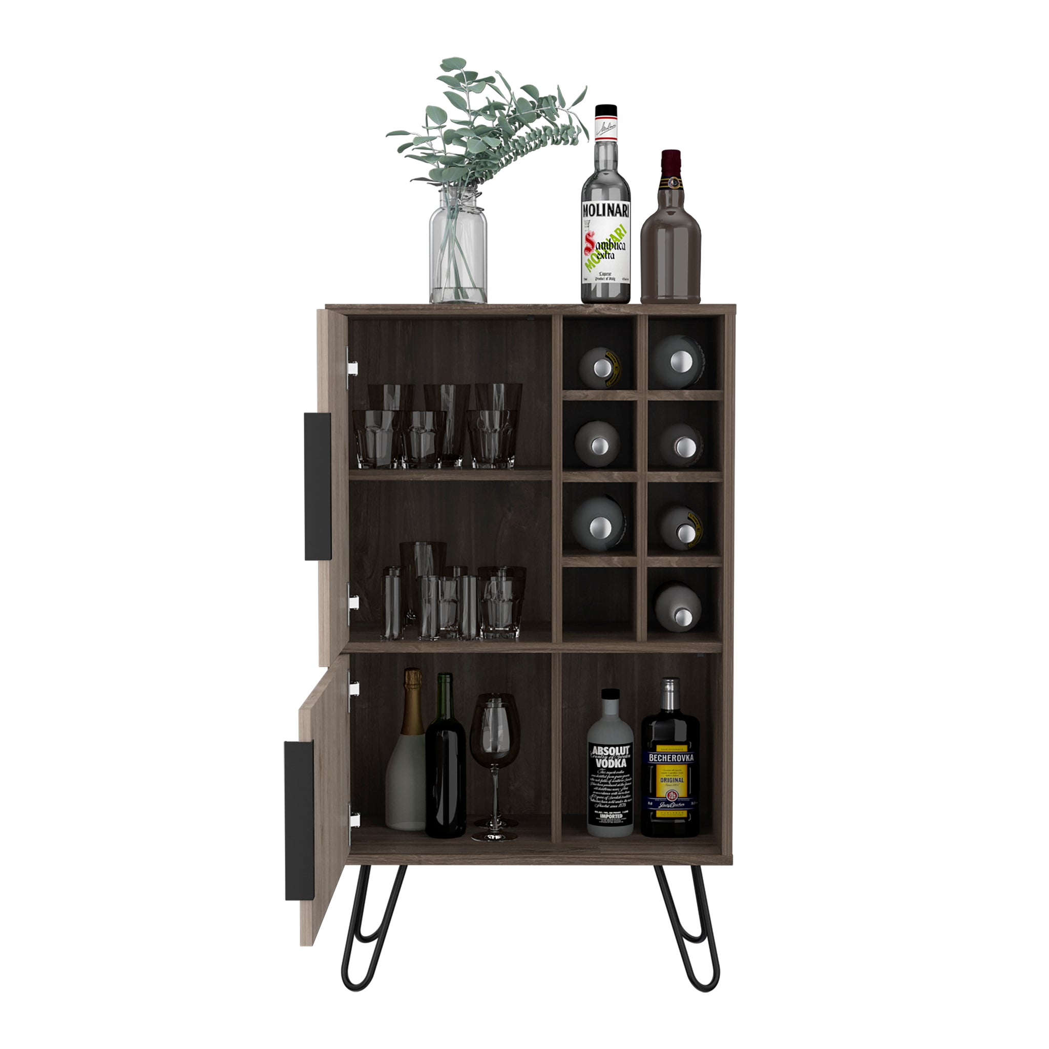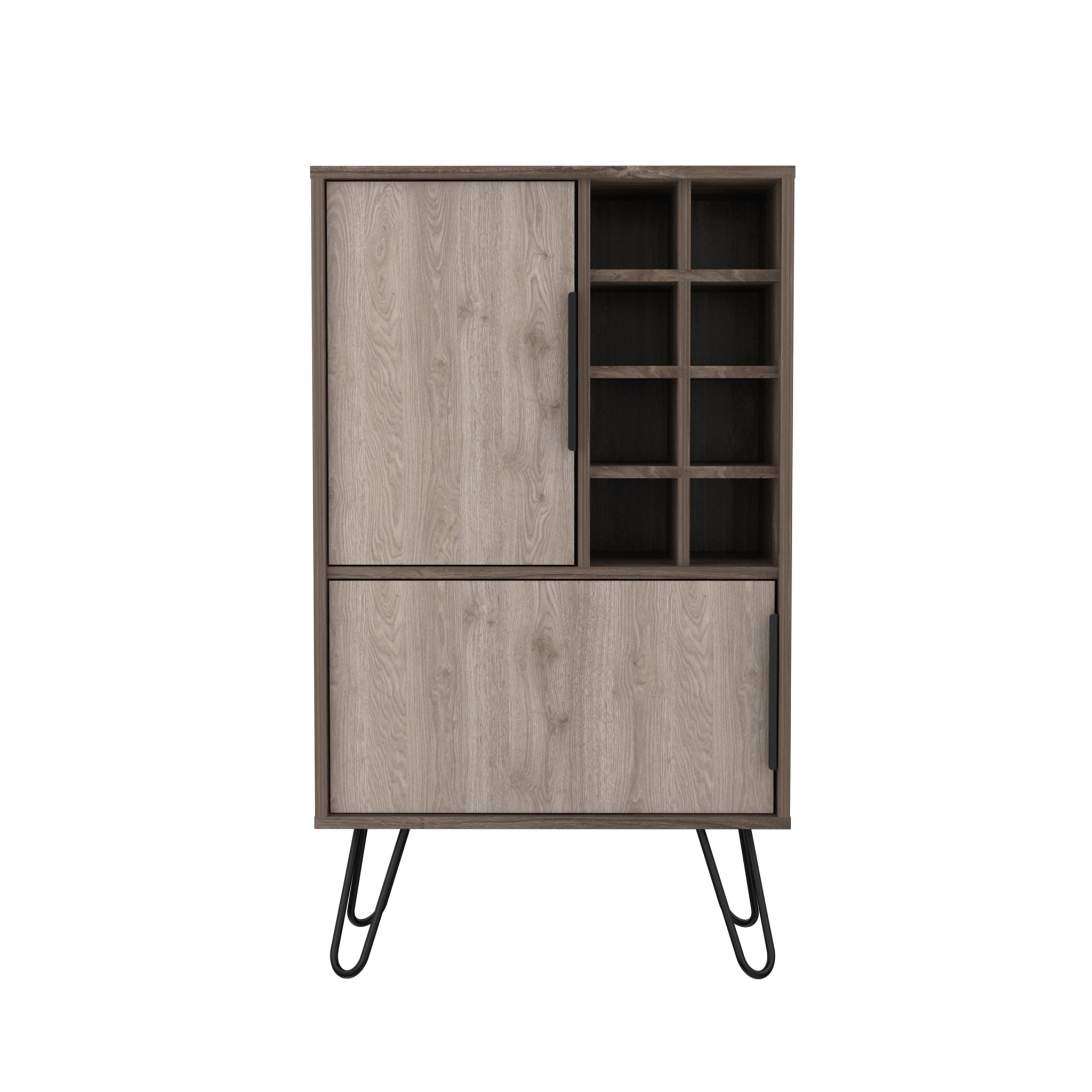 • The Nevada Drinks Cabinet. Carefully crafted with light and dark oak effect wood to provide a contrasting effect, this drinks cabinet is both luxurious and practical coming with sleek handles with the unit sitting on metal pin legs. The Nevada Drinks Cabinet offers the perfect storage solution for all of your favourite drinks and cocktails. This unit is every drink connoisseurs dream. This bar cabinet comes with bottle slots, suitable for storing bottles of wine or whiskey, whatever takes your fancy! The bottom of the unit boasts two generous shelf compartments concealed by a single door, this space is ideal for storing large glasses and more alcohol of course! There are two further cupboard spaces, use these to store your glasses and drinks accessories. The Nevada Home Bar enables you to have a 'one stop shop', allowing you to pour your drinks at a place convenient to you. Complete your entertaining space and get all of your guests talking with this truly fine drinks cabinet. This product comes unassembled.