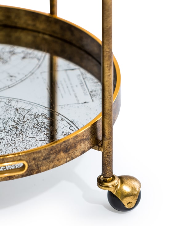 Three Tier Gold Antique Bar Trolley. Combining practicality and style, this beautiful piece would be the perfect addition to any home. This unit features an eye-catching antique gold finish with handles at the top making transportation an ease. The trolley's standout feature are the three round mirror shelves each finished with a different detail. Palm trees, leaves and globe detailing all feature on the shelves as seen in the photo. Allow the drinks trolley to do all the hard work and impress guests at cocktail hour with this fine piece. Store all of your favourite drinks on the trolley so they're readily available at dinner parties or when you fancy a drink. The trolley can be styled to suit your decor.